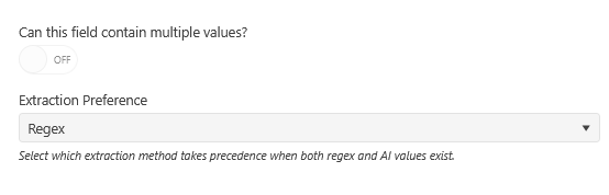 The attribute can only store a single value. A single value requires the workspace administrator to specify which automation tool populates the field: regular expressions (Regex) or AI data extraction, since the field can only accept a single value.