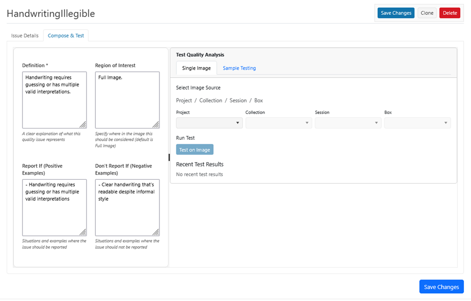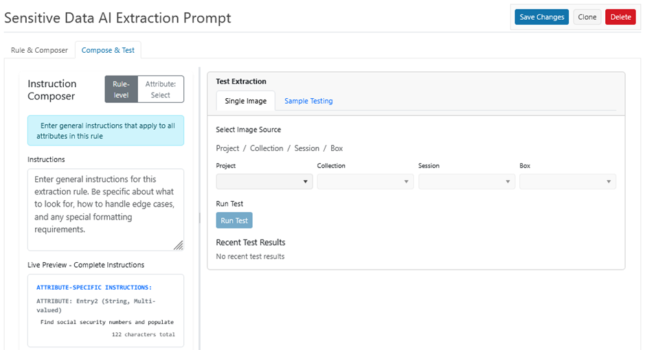 There are two (2) methods for testing attribute and data extraction rules: Single Image and Testing Sample. To test the rule, first go to the Compose & Test tab as shown.