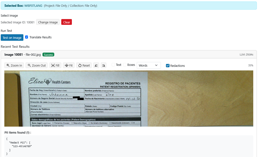 The AI testing modules can translate the results of a prompt written in English to other languages. This allows for the composition of a prompt to be written in English and perform the data extraction on images in other languages. Select the Translate Results to see the English version of the extracted data.