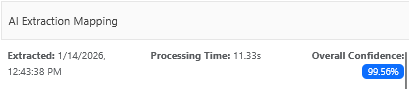 AI Data Extraction Confidence Score is provided in the AI Extraction Mapping Tile in the Review page. See AI Data Extraction Confidence for information on how the confidence score is calculated.