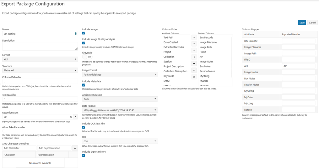 The metadata for images can be exported without the images. This feature is useful when the images for a given box have not changed, but the metadata or attributes may have changed through user review or as a retroactive update to Taxonomy.The result of the Image Quality Analysis performed by Artificial Intelligence.You can opt to include Attributes and specify which type or use logic to determine which type of attribute is exported. (SeeSection 13.2.9 Attribute Classification for more details)The OCR text results for an image can be exported as a separate file. This is recommended if you do not export PDF files. (SeeSection 13.2.11 Include OCR for more details)The export history for a record can be included with the export. This can assist with cleaning up and duplicate records due to multiple exports of the record. (SeeSection 13.2.20 Export History for more details)