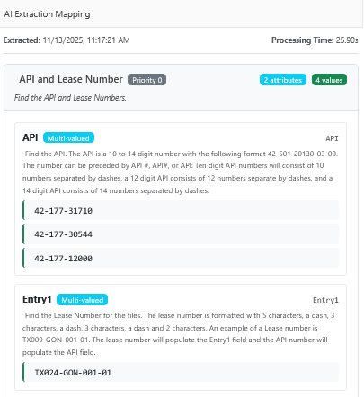 Displays the extracted values from the images for a box or image, based on the AI Data Extraction Rule(s) assigned to the taxonomy for the collection.
